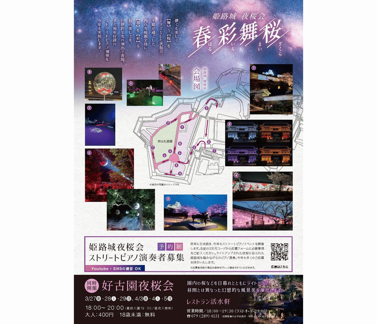 2026年の姫路城夜桜会「春彩舞桜」では、【舞】う【桜】をテーマとした夜桜会になっており、千姫が過ごした西の丸庭園全体に【春】を【彩】る桜の美しさを幻想的な光の演出で表現し、また毎年好評のストリートピアノ演奏も披露されます。